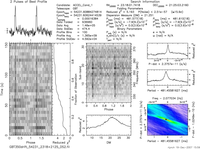 In 2007 the GBT’s track was being repaired, which meant that it could not be rotated and tilted to point at specific areas of the sky. Instead, the scientists conducted a “drift scan” – simply collecting data as the sky drifted past while the GBT remained in a fixed position. In all, more than 130 Terabytes of data were collected. Of that, approximately 300 hours of data is reserved exclusively for the students’ research. At a rate of approximately 48 pseudo-pointings per hour of data, and each pseudo-pointing containing approximately 40 plots, that’s more than 660,000 plots for the students to analyze.